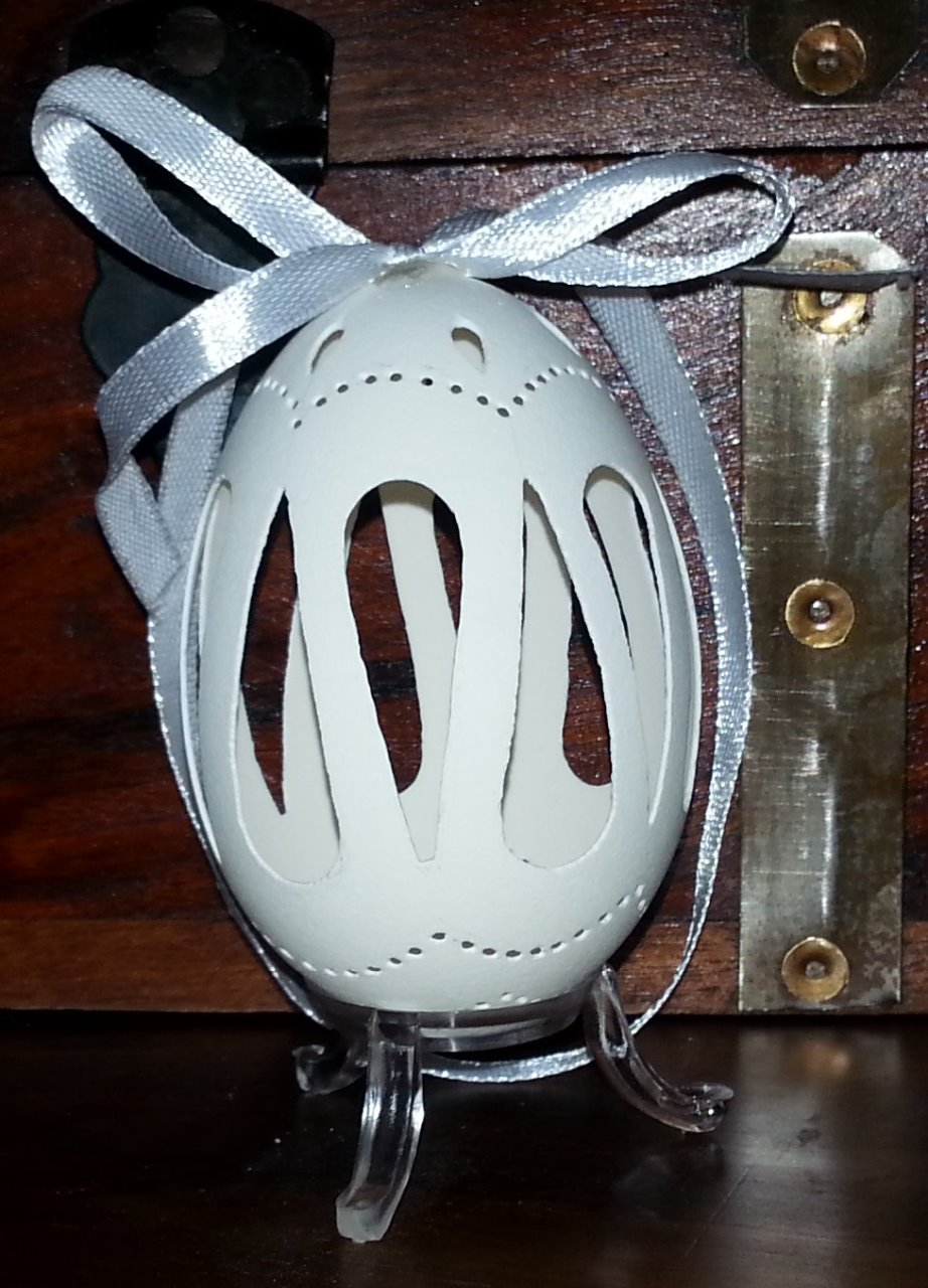 Wunderschönes handgefertigtes Gänseei mit weißer Schleife.
